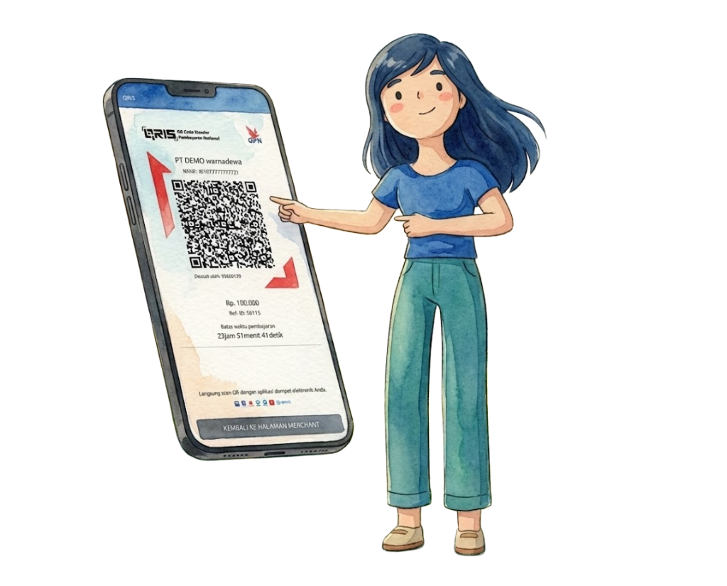 - QR Kode ditampilkan melalui payment page Website / Aplikasi / Toko Online Anda ataupun ditampilkan pada monitor atau struk yang dicetak pada mesin EDC